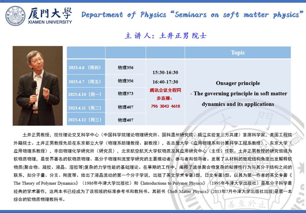 主讲人:土井正男教授,现任理论交叉科学中心(中国科学院理论物理研究所、国科温州研究院、瓯江实验室三方共建)首席科学家,美国工程院外籍院士。土井正男教授先后在东京都立大学(物理系助理教授、副教授),名古屋大学(应用物理系和计算科学工程系教授),东京大学(应用物理系教授),丰田物理化学研究所(研究员),北京航空航天大学软物质及其应用研究中心(主任)任职。土井正男教授的研究领域为软物质物理,是世界著名的软物质物理、高分子物理和流变学研究的主要推动者、参与者和领导者。发展了从材料的微观结构角度出发解释软物质(聚合物、凝胶、液晶、溶胶等)复杂的力学性能的基础理论。在早期的工作中,阐释了流体聚合物复杂的粘弹性行为与其分子结构之间的联系,如分子量、分支、刚度等。给出了液晶流动的第一个分子学说,出版了英文学术专著3部,日文专著3部。以其为第一作者的英文专著《The Theory of Polymer Dynamics》(1986年牛津大学出版社)和《Introductions to Polymer Physics》(1995年牛津大学出版社)是高分子科学最经典的学术著作,这两本书已经成为了该领域的标准参考书和教科书。其新书《Soft Matter Physics》(2013年7月牛津大学出版社出版)是第一本综合的软物质物理教科书。