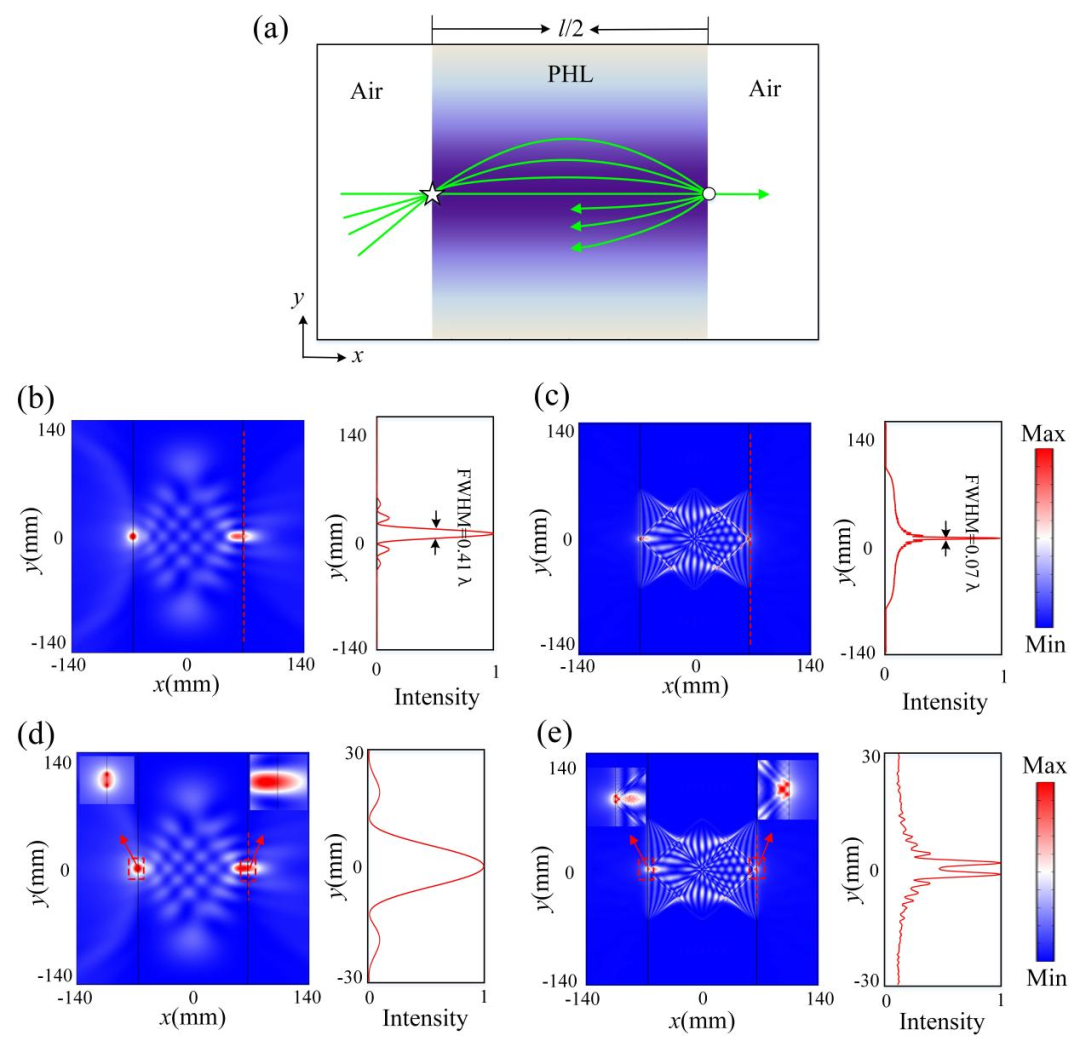 图3. Mikaelian透镜和完美双曲超透镜成像性能的对比。 (a) 点光源经过透镜成像的示意图。 (b-c) Mikaelian透镜以及 (d-e) 完美双曲超透镜对于单个点光源的聚焦性能,以及对于双点光源的超分辨能力。