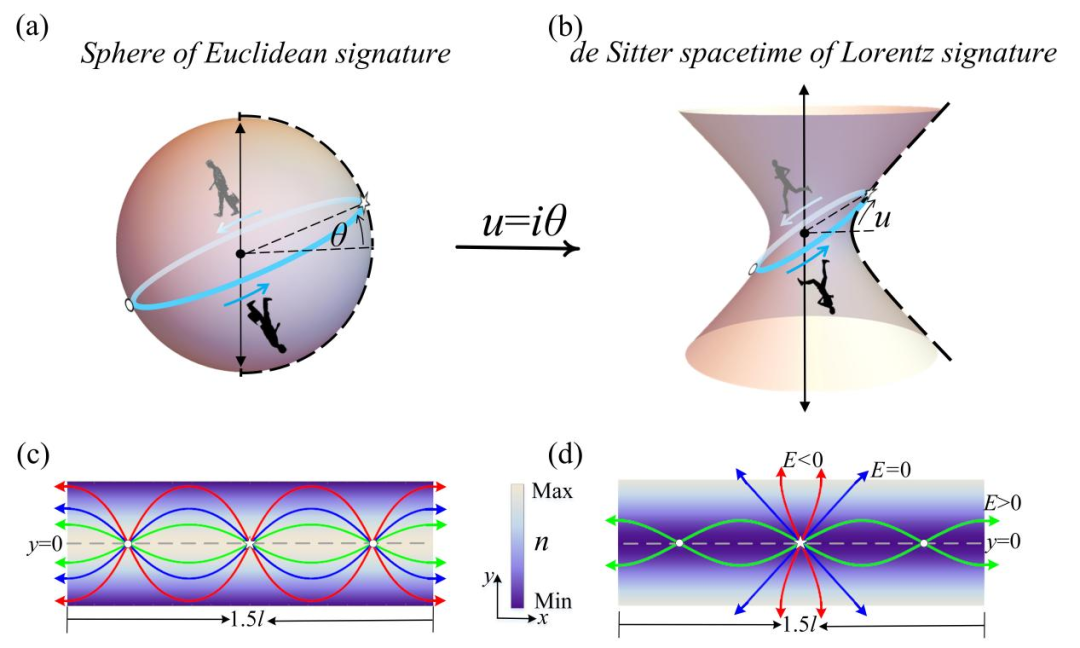 如图1所示,洛伦茨规范下的德西特时空度规与球面度规仅相差一个wick变换 u=iθ 。基于Mercator投影, 可以将德西特度规变换为一个继承了Mikaelian透镜完美几何成像特性的双曲渐变折射率分布(即完美双曲超透镜)。并且根据入射方向不同,它能支持双曲波的自聚焦传播和发散模式。在波动光学中,我们可以通过控制材料电磁参数的符号来精准筛选出所需要的模式(见图2)。有趣的是,双曲波的自聚焦电场分布与宇宙学中通常用于描述时空不同点之间因果关系的彭罗斯图高度相似。