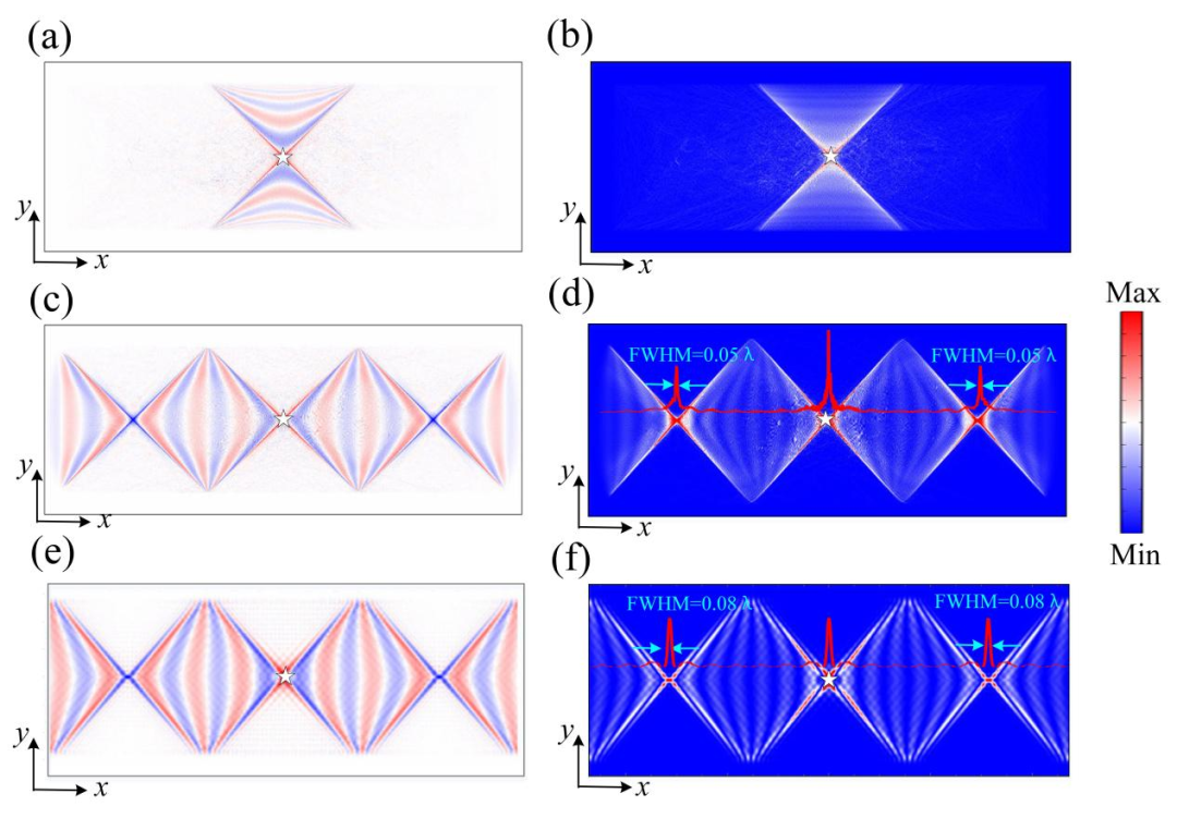 图2. 基于完美双曲超透镜的电场模式和相应强度分布的 (a-d) 数值模拟和 (e-f) 解析结果。其中 (a-b) 对应面内磁导率 μx=1, μy=-1,(c-f)对应面内磁导率 μx=-1 , μy=1。