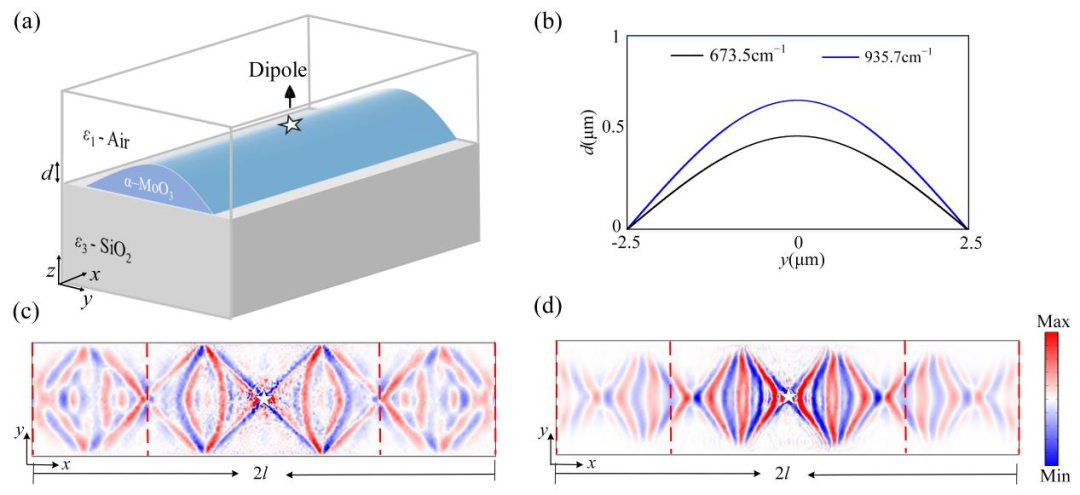 图4. (a) 具有渐变厚度的三维 α-MoO3 波导模型示意图。 (b) α-MoO3 薄膜厚度与坐标 y 之间的关系。频率分别为 (c) 673.5 cm−1 和 (d) 934.7 cm−1 时,结构表面的双曲声子极化激元传播电场分布。