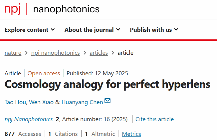 该研究工作于2025年5月12日以“Cosmology analogy for perfect hyperlens”为题发表在npj nanophotonics上。厦门大学博士生侯韬为论文第一作者,陈焕阳教授为论文的通讯作者。该工作得到了国家重点研发计划、国家自然科学基金委员会等项目的支持。