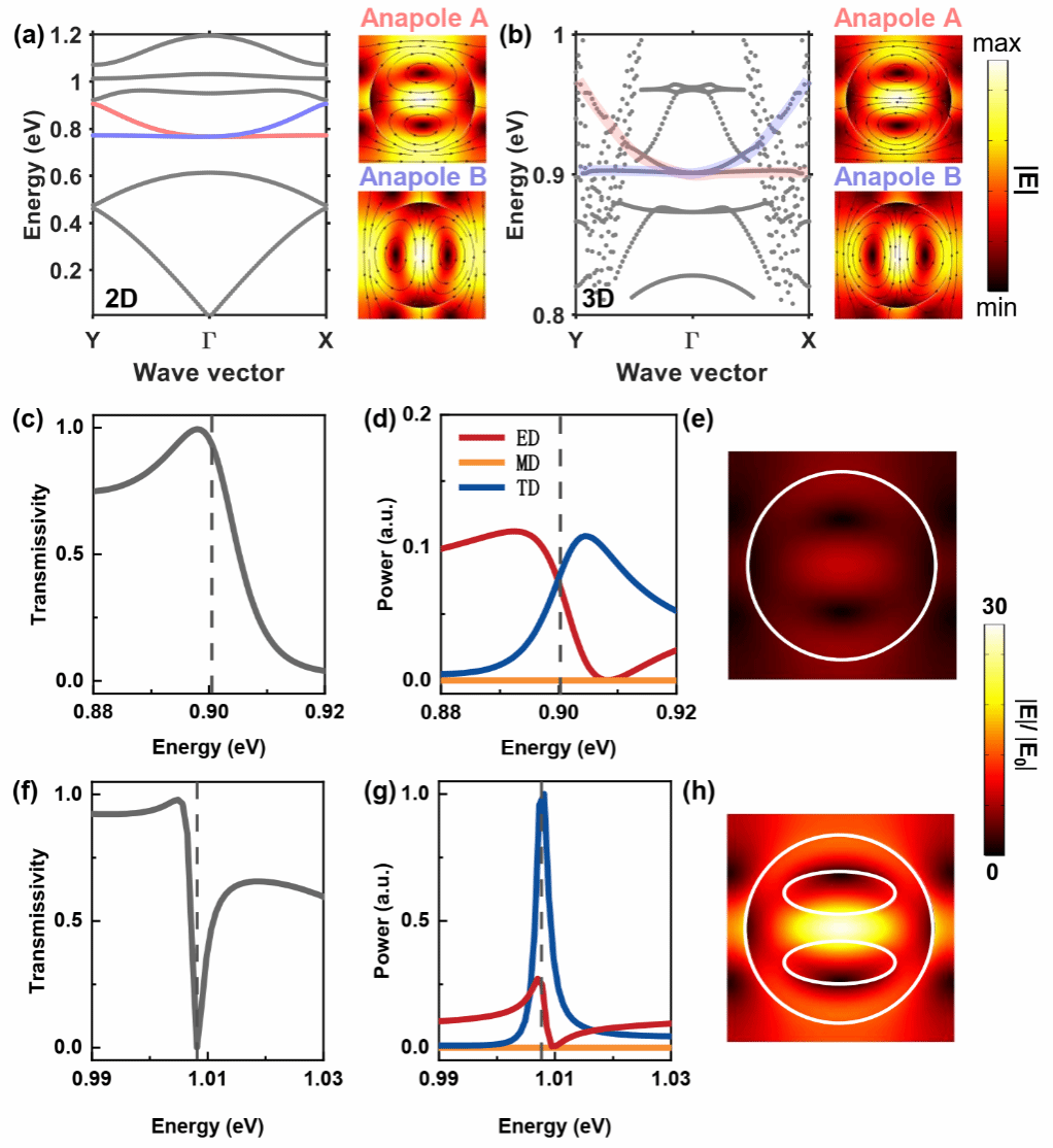 本研究利用定制电磁无极模式的策略,成功在近红外波段实现了光子平带的高效远场激发与灵活调控。Anapole模式源于电偶极子(ED)与环形偶极子(TD)的干涉相消效应。当两者强度相近且相位相反时,系统在远场表现出近乎为零的散射,同时能量高度局域于结构内部,从而产生显著的近场增强效应。研究人员通过设计并激发硅盘的无极模式,并在硅盘结构中引入经拓扑优化的椭圆形空气孔,有效调控了TD与ED的相对强度,打破了原有的散射相消条件,在维持近场高度局域的前提下,成功使anapole模式在远场光谱中显现。与传统多极子共振相比,本研究设计的anapole模式不仅具备高度局域化的近场增强能力,还展现出动态可调的远场辐射特性,为实现光子平带从非辐射态到辐射态的精准调控提供了有效途径。
