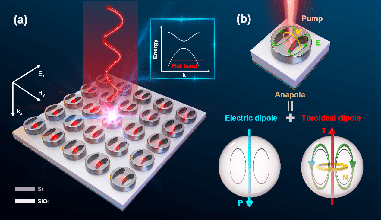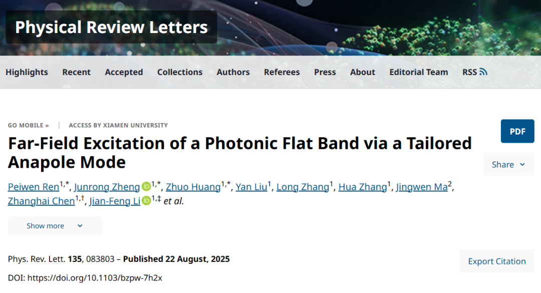近日,厦门大学物理科学与技术学院杨志林教授团队、陈张海教授团队联合电子科学与技术学院易骏副教授团队、化学化工学院李剑锋教授团队,在光子平带(Photonic Flat Band)研究领域取得重要突破。研究团队创新性地利用新型光学局域模Anapole Mode(无极模),成功实现了光子平带的远场激发与动态调控,解决了光子平带难以与远场高效耦合的关键难题。相关研究成果以《Far-Field Excitation of a Photonic Flat Band via a Tailored Anapole Mode》为题,发表在《Physical Review Letters》杂志上(DOI: https://doi.org/10.1103/bzpw-7h2x)。