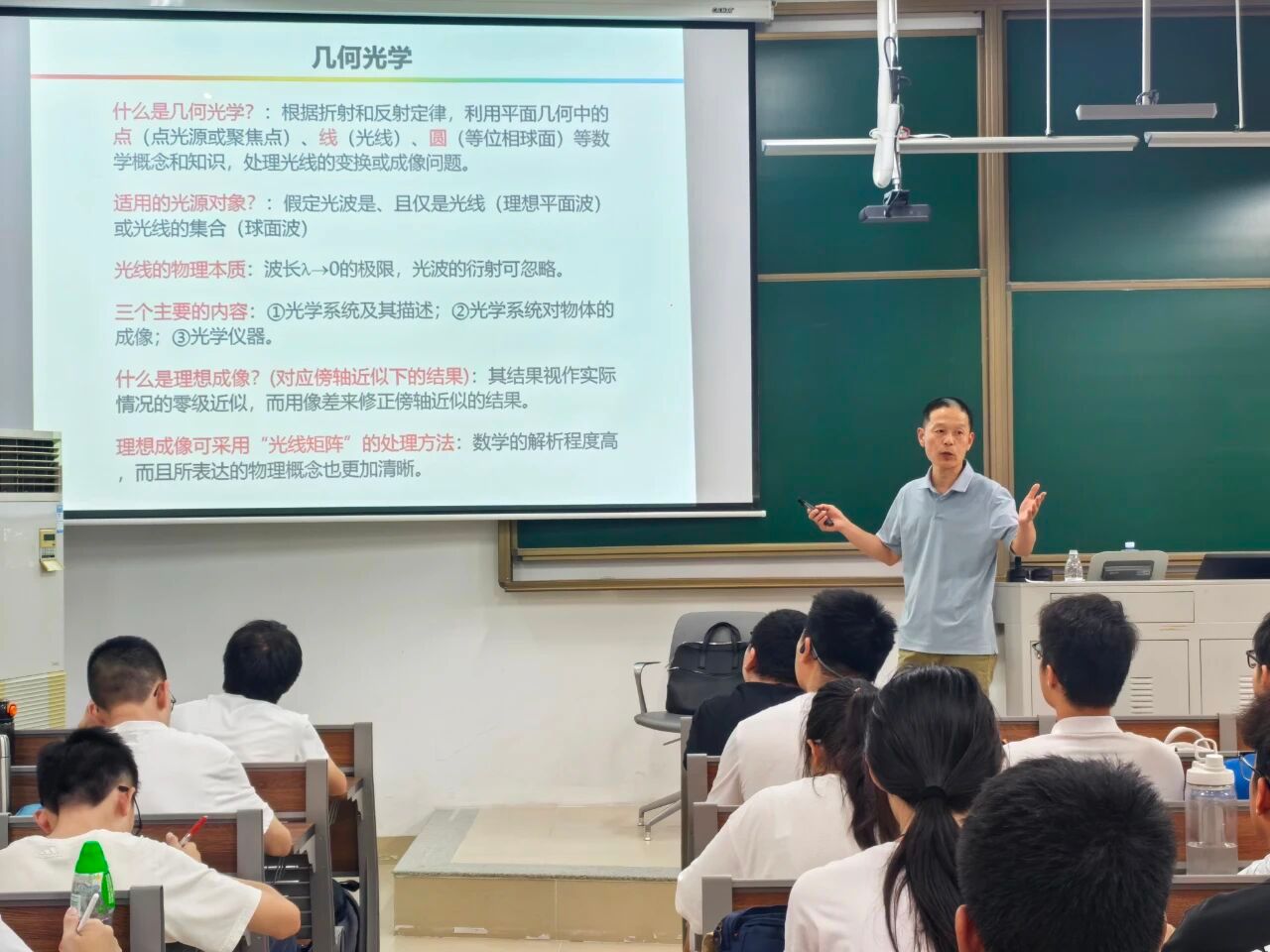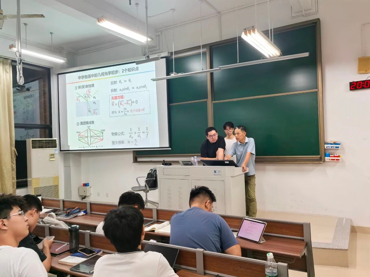 当晚课堂的主题是“傍轴几何光学”。首先,在“数学是物理学的语言”的哲理的指引下,钱教授强调了光学中最基本的傍轴近似,指出该近似使得光线传输线性化以及光学成像理想化。因此,线性代数中的矩阵方法最为适合于处理傍轴几何光学成像;其次,针对含有多个光学界面和元件的复杂系统,钱教授讲授了通过矩阵运算能够使得我们一次性地获得最终结果,而无需逐次计算每个界面和元件成像的中间环节。这让同学们切身体会到“用数学表达物理之美”;最后,钱教授通过生动实例和逻辑严密的理论推演,引导学生逐步深入光学世界,不断激发思考与追问。同学们积极响应,在课间踊跃提问,课堂氛围热烈活跃。