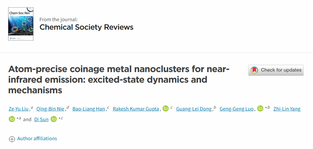 原子级精确结构的金属纳米团簇因其独特的电子结构和优异的发光性能,近年来在光电器件和生物医学成像等领域展现出巨大的应用前景,业已发展成为国际纳米科学、物理学、化学、材料学等众多学科的研究热点。然而,金属团簇由于近红外发光量子产率低且发光机制不明晰,严重制约了其从基础研究迈向实际应用。近日,厦门大学杨志林教授、华侨大学骆耿耿教授与山东大学孙頔教授合作,在国际权威期刊《Chemical Society Reviews》(英国皇家化学会出版,2023年影响因子40.4,2年影响因子54.6)上发表了题为"Atom-precise coinage metal nanoclusters for near-infrared emission: excited-state dynamics and mechanisms"的综述论文,系统总结了近年来在金属纳米团簇的激发态动力学和光致发光机制研究方面的重大进展并对该领域的发展方向做了展望。