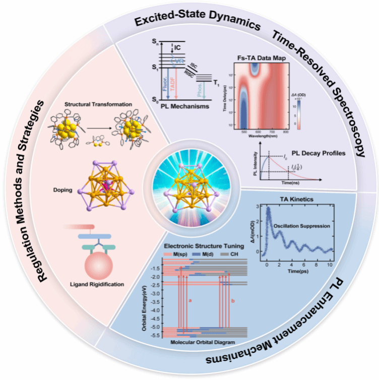 图. 金属纳米团簇的激发态动力学、发光增强机 制和策略概述示意图。