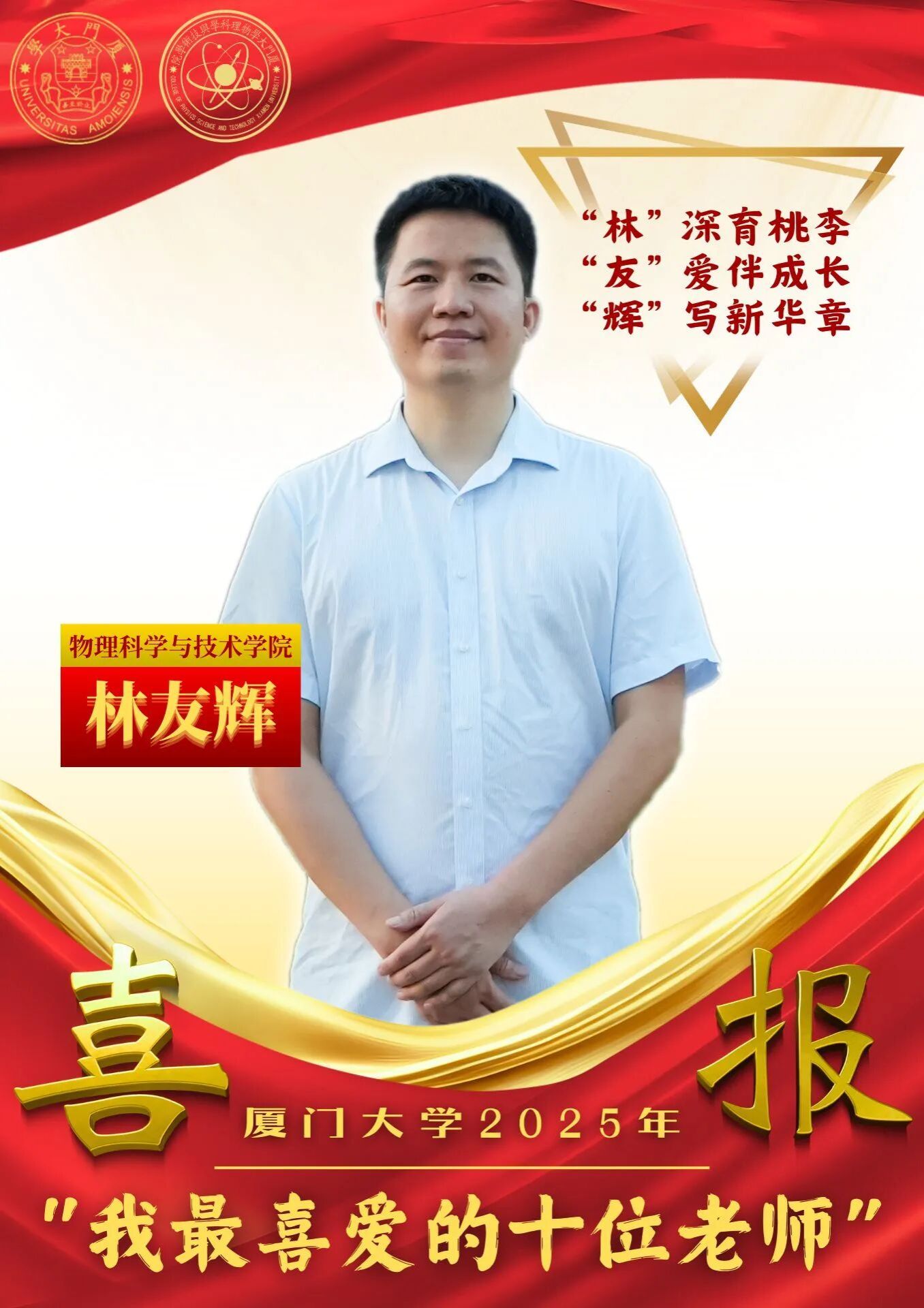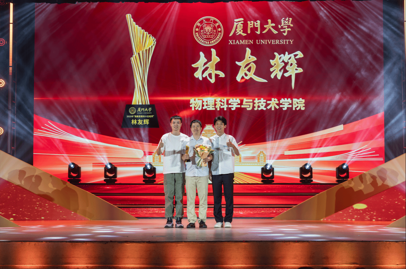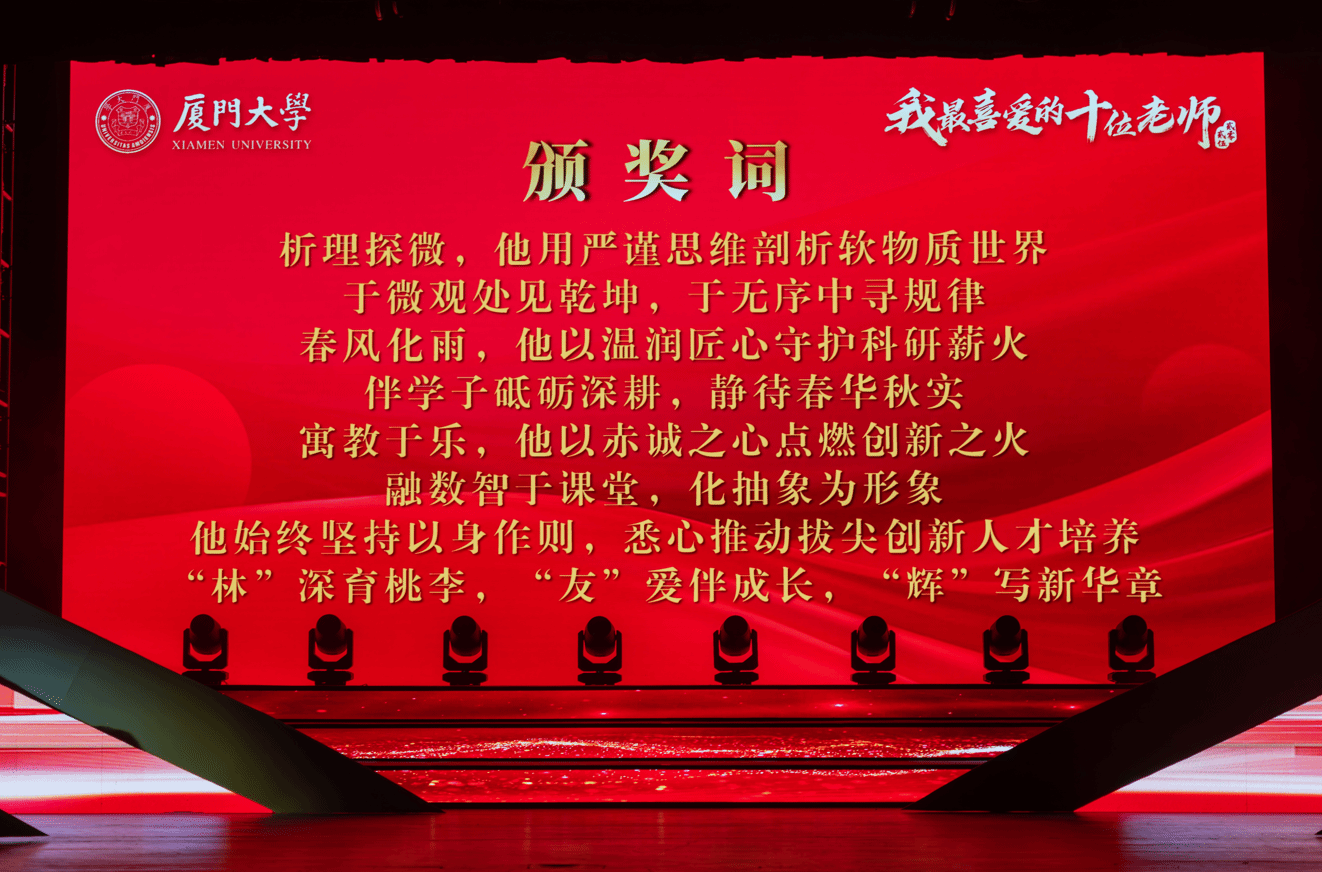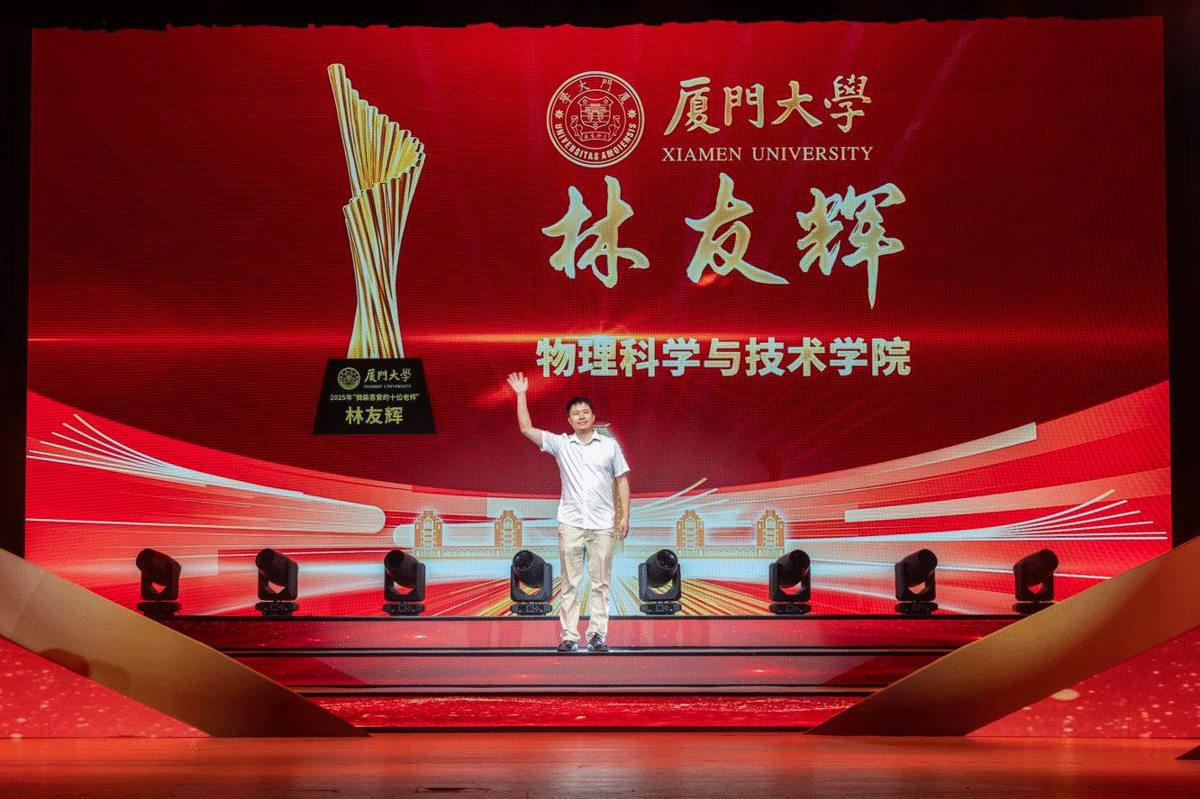 9月10日晚,厦门大学2025年“我最喜爱的十位老师”颁奖典礼在建南大会堂举行,经过学院推荐、个人展示、学生评选等环节,物理科学与技术学院林友辉老师高票获选“我最喜爱的十位老师”。