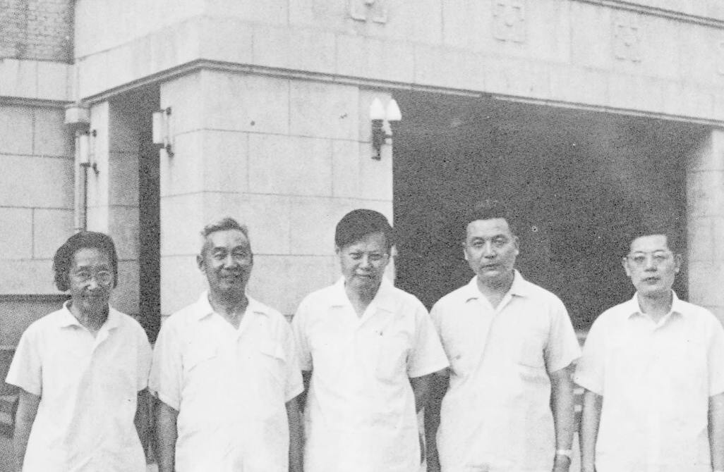1972年杨振宁与王承书(左一)、张文裕(左二)、邓稼先(右二)、周光召(右一)于北京