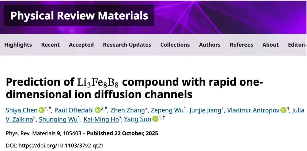 该研究工作以“Prediction of Li3Fe8B8 compound with rapid one-dimensional ion diffusion channels”为题发表在Physical Review Materials 上 (DOI: 10.1103/37v2-qt21)。物理学系博士生陈诗雅为论文第一作者,爱荷华州立大学研究生的Paul Oftedahl为共同第一作者,孙阳教授为通讯作者,研究获得了厦门大学物理学院吴顺情教授、爱荷华州立大学Julia Zaikina教授和Kai-Ming Ho教授的重要帮助和指导,以及国家自然科学基金和厦门市自然科学基金的支持。