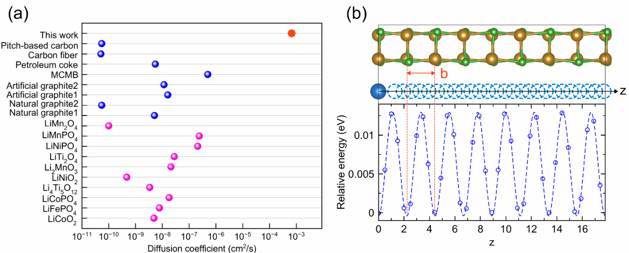 图2. (a) Li3Fe8B8的扩散系数与代表性电池材料的扩散系数的比较。蓝色表示碳基导电添加剂材料;粉色表示常见电极材料。 (b) 沿 z 方向由Fe4B4骨架产生的周期势场。