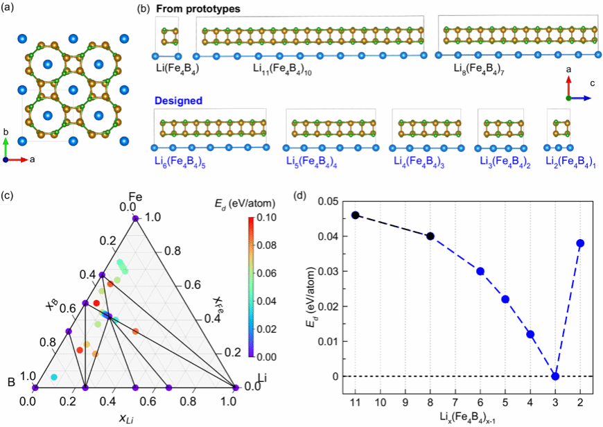 图1. (a) Lix(FeB)y型结构图。 (b) 由不同数量的Li与(Fe4B4)单元构成的一系列结构。上图:由原型结构替换得到的体系;下图:设计的Lix(Fe4B4)x-1相。 (c) Li–Fe–B体系新相图。(d) 随Li含量变化的Lix(Fe4B4)x-1能量。