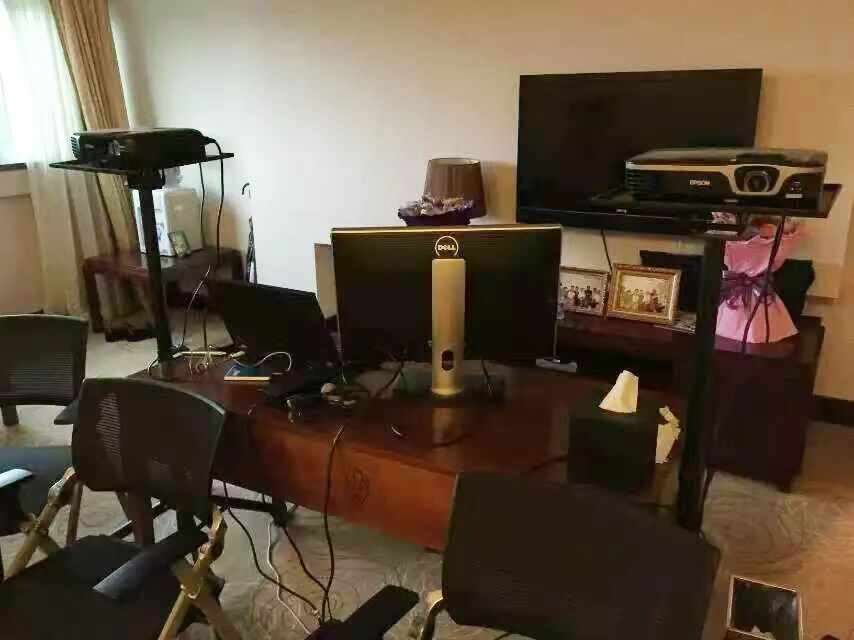 图3. 上课地点安排在萨老师所住的厦大逸夫楼房间,萨老师坐在电脑前,学生们坐在带有小桌板的椅子上,对面则是投影幕布。幕布旁有一块白板,萨老师会在白板处给我们推导公式和画示意图。