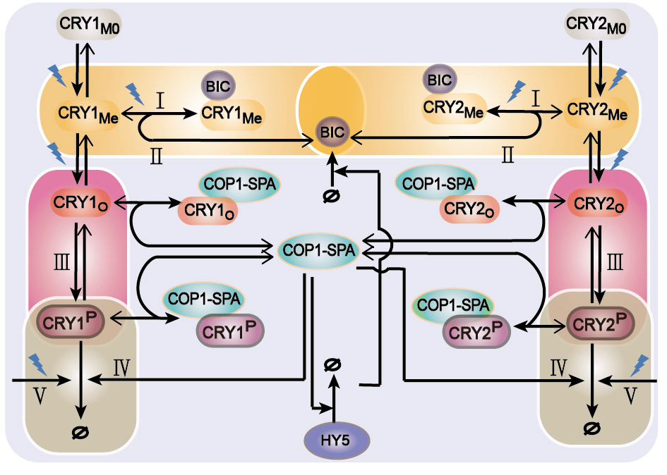 光不仅是植物光合作用所必需的能源,还是调控植物整个生长发育过程的重要环境信号。光受体是植物的“眼睛”,植物通过光受体感知环境中不同波长的光,并起始光信号转导调控植物生长发育。蓝光受体隐花色素Cryptochromes(CRYs) 存在于包括人类在内的所有动植物中,植物隐花色素参与调控植物的光形态建成、光周期开花、生物钟节律等过程。利用数学模型定量的描述和分析光信号网络,对于阐明光信号网络中的光受体及下游蛋白的精细调控过程和作用机理具有重要意义。