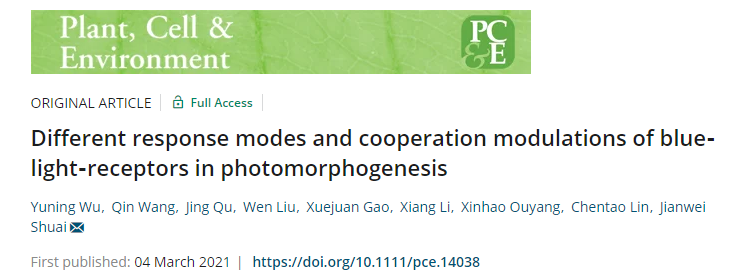 近日,厦门大学物理科学与技术学院帅建伟课题组和福建农林大学林学中心王琴课题组,以及美国加州大学林辰涛教授合作,在国际知名期刊Plant, Cell & Environment 上发表了题为“Different response modes and cooperation modulations of blue-light receptors in photomorphogenesis” 的研究文章,详细报道了在不同强度的蓝光条件下蓝光受体CRYs、 BIC和复合物COP1-SPA的相互调控机制,理论结合实验阐述了两类蓝光受体CRY1和CRY2在响应蓝光刺激时是如何扮演各自的角色并实现协同调控的过程。