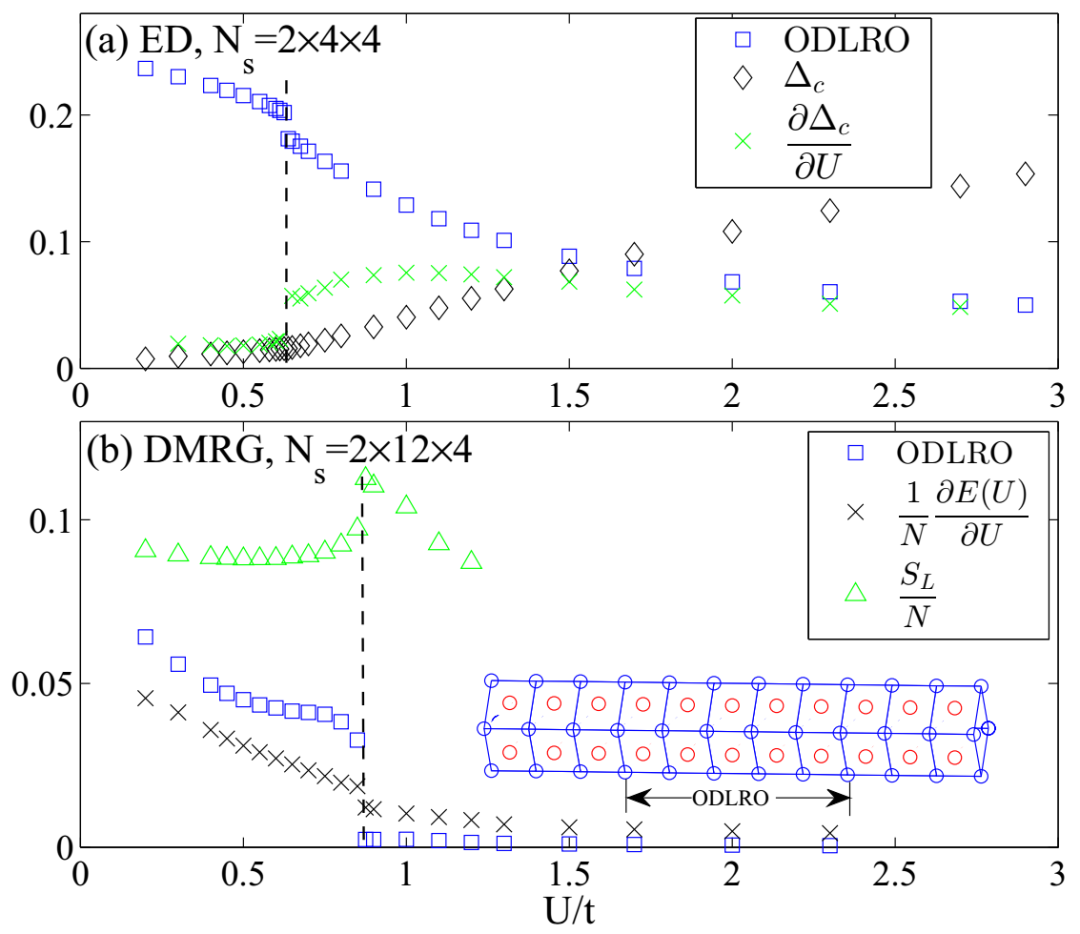 图1 玻色Laughlin v=1/2分数量子霍尔效应与玻色子凝聚体之间的不连续一阶相变(ODLRO代表非对角元长程序,在强相互作用U/t>>1时是分数量子霍尔效应,在弱相互作用U/t<1时是玻色凝聚体)