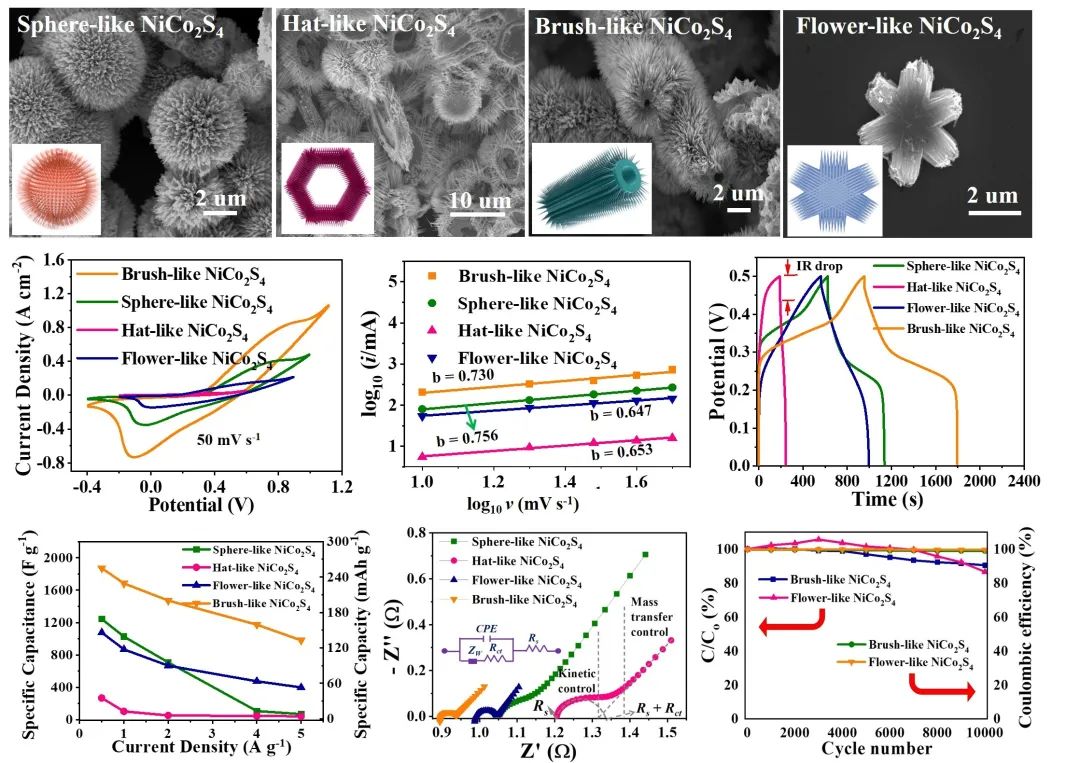 该成果以“Electrochemical Charge Storage Behavior of Various NiCo2S4 Hierarchical Microstructures”为题发表在美国APS杂志Physical Review Applied上(Phys. Rev. Applied, 2021, 15, 064042)。