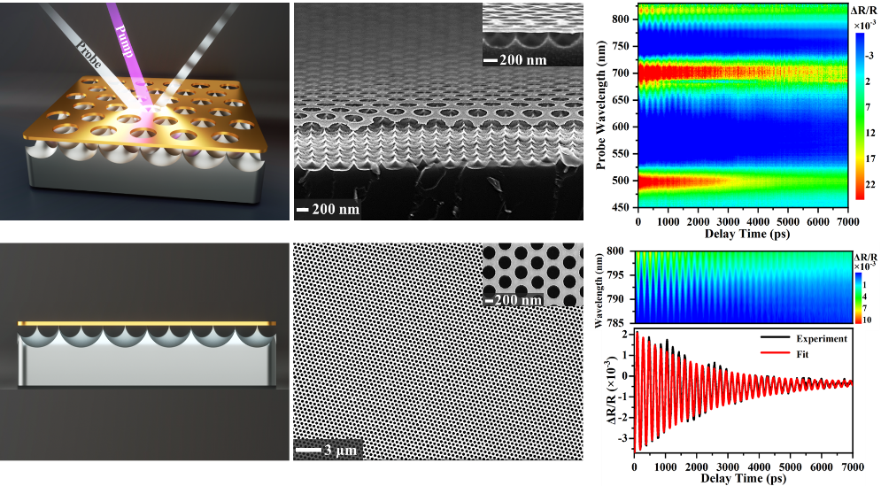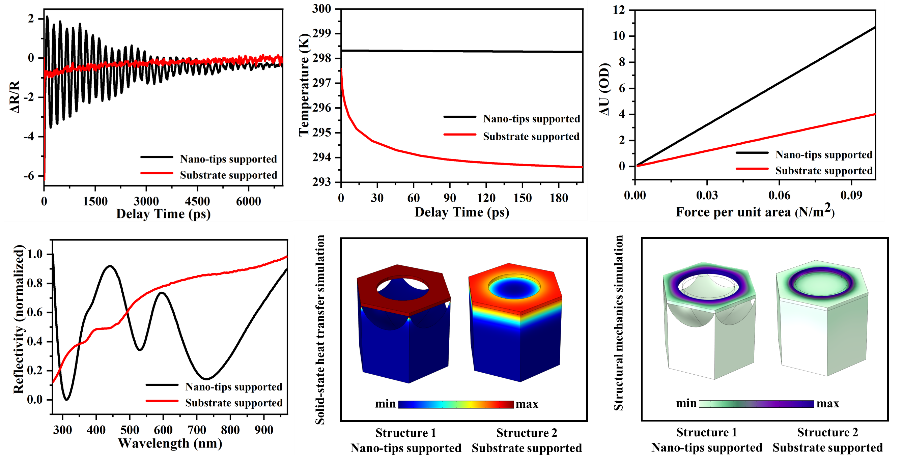 纳米光机系统指通过光诱导电磁力、热应力、辐射压力或梯度力来驱动纳米结构运动或机械振荡的能量转化系统,由于其精确可控的光学共振和机械振荡响应特性而在全光机械操纵、光信号处理、超灵敏机械传感以及声子的量子操纵等方面具有巨大的应用潜力。然而,传统的光机械系统由于较高的能量损耗问题而严重限制了纳米光机械系统的进一步发展。在该工作中,杨志林教授团队通过导向自组装和电感耦合等离子体刻蚀工艺,成功设计并制备了一种针尖支撑的超高均一度半悬浮态纳米光机械超表面,该超表面可达到平方厘米量级。小于5纳米的针尖支撑的半悬浮超表面有效地提高了光机系统对脉冲激光的近场能量耦合效率,同时最大程度地减小了结构的机械能和热能损耗,最终在超快全光光机操控中大幅度提高了光机转换效率,并将有效振荡时间提高了近两个数量级。这种多通道能量减损的纳米光机系统的设计思路可以被推广到目前绝大多数片上加工的光机械系统的性能提升上。同时,这种半悬浮态光机超表面的结构设计策略将推动稳态超材料向超快可重构的方向发展,并将进一步推动光机系统的高度集成化。