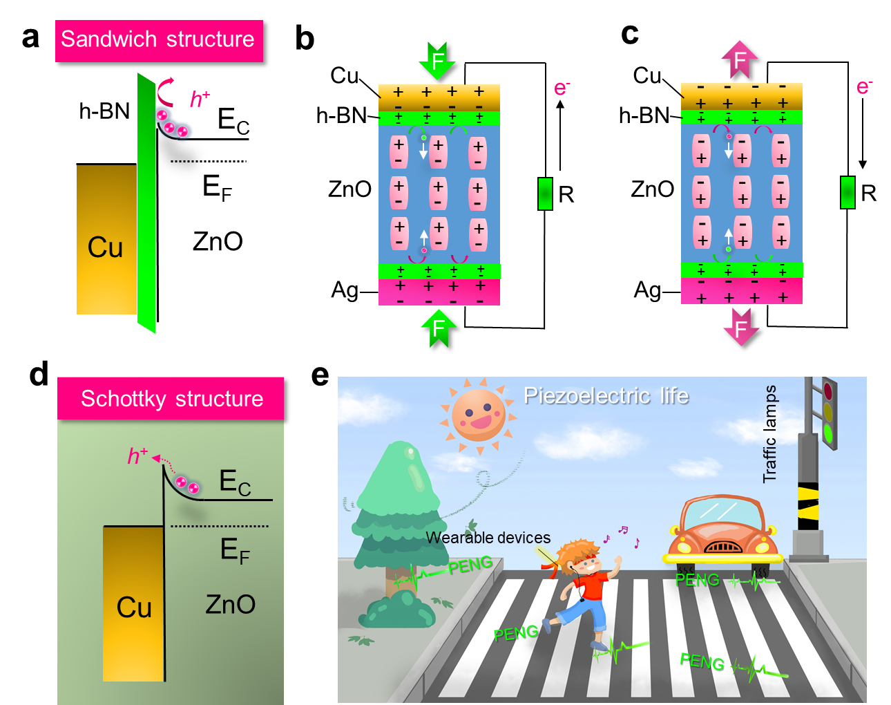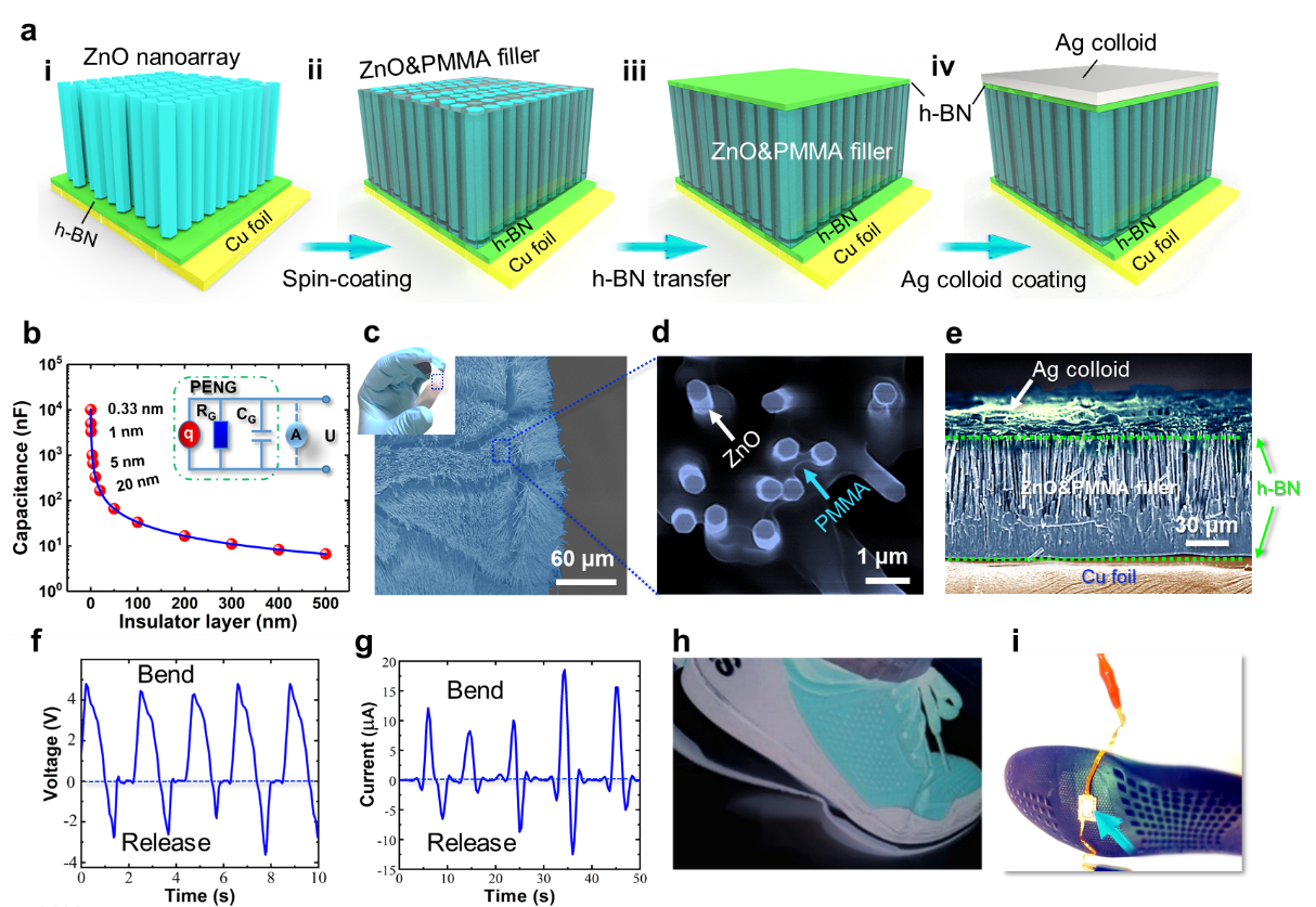 蔡端俊课题组针对多晶、非晶衬底上晶体难以生长的共性难题,基于二维h-BN材料范德华弱作用力表面和六方晶格特性,提出范德华预导向层概念,并实现了在柔性多晶Cu纸表面直接诱导生长了超长、取向一致的ZnO纳米柱阵列,高达75 μm、直径550 nm,长径比超过100。进而,设计了h-BN/ZnO纳米柱/h-BN三明治结构,研发肖特基介电式的柔性透明压电纳米发电机。从理论上阐明,界面电容与介电层厚度呈指数反比快速增加的物理规律,并在国际上首次将介电层厚度推进到了单原子层极限,获得电容极值。同时结合Cu纳米线网络的柔性透明电极技术,制备了全透明的柔性纳米发电机,符合可穿戴应用需求。该发电机利用了h-BN的超薄和高势垒有效抑制了压电纳米发电机中自由载流子的移动,提高了感应输出电能,开路电压达5 V,短路电流约为18 μA,最大输出电功率密度高达169 mW/cm2。最后,该纳米发电纸器件成功地应用到了人体运动机械能(如行走、跑步)收集发电,并获得智能随身充电器,未来可以人体自身作为智能电子产品的“充电宝”,展示了在未来自供能、可穿戴设备中的应用潜力和巨大市场。