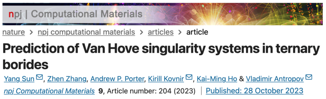 ATB4系列材料的发现将为研究范霍夫奇点系统以及调控新的量子态提供机会。作者所使用的寻找具有范霍夫奇点材料的理论计算方法可以进一步推广至其他体系,从而加速新型量子材料的发现。相关研究成果以“Prediction of Van Hove Singularity Systems in Ternary Borides”为题在计算材料学顶刊npj Computational Materials上发表(DOI: 10.1038/s41524-023-01156-8)。计算凝聚态物理研究组孙阳副教授为该论文的第一作者和通讯作者,爱荷华州立大学的Kirill Kovnir教授和Vladimir Antropov教授为共同通讯作者,厦门大学物理学系为第一单位。