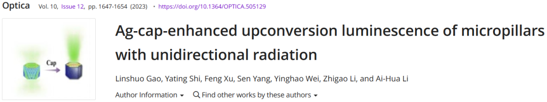 近日,厦门大学物理系李艾华老师与研究生高林烁在镧系发光增强领域取得重要进展,相关成果以“Ag-cap-enhanced upconversion luminescence of micropillars with unidirectional radiation”为题在线发表于Optica的旗舰期刊《Optica》上。
