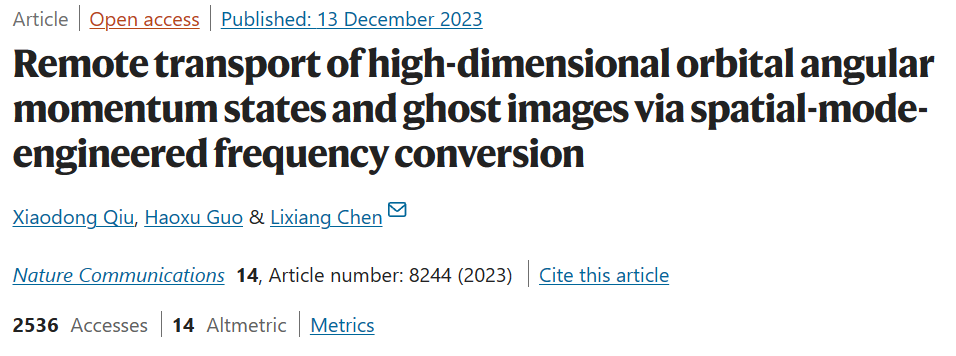 厦门大学物理科学与技术学院陈理想教授团队基于结构光场非线性操控,在实验上实现了高维量子态的远程传输及无相互作用量子成像,相关成果以“Remote transport of high-dimensional orbital angular momentum states and ghost images via spatial-mode-engineered frequency conversion”为题在线发表于Nature Communications 14, 8244 (2023)。