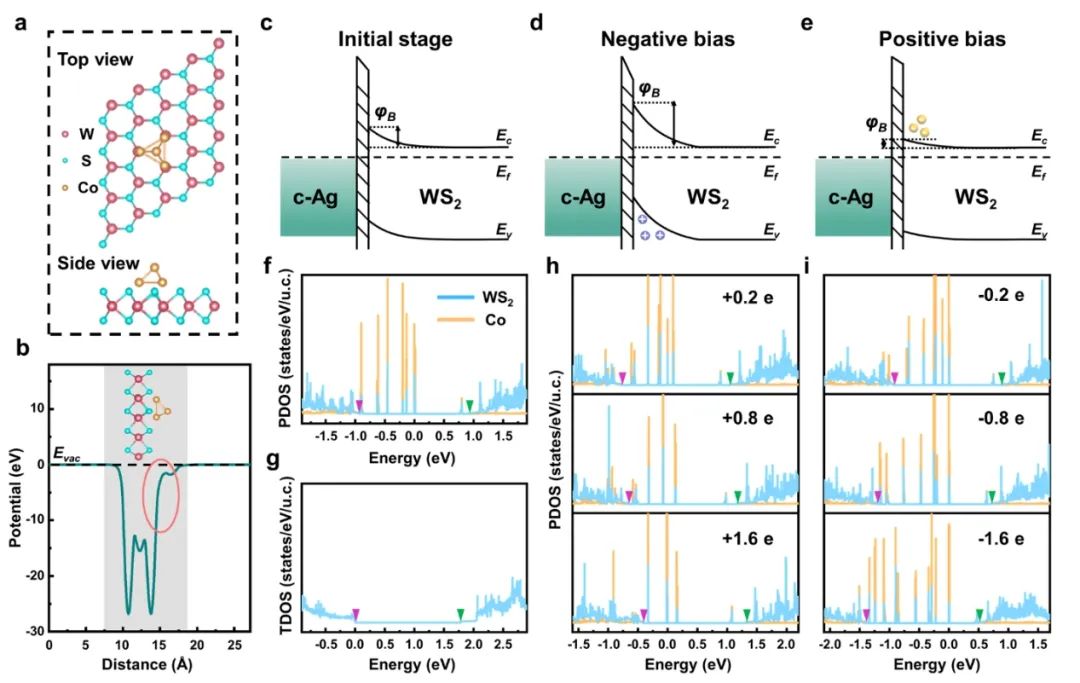 图3. 正负偏压下界面势垒及Co量子点/WS2异质结投影态密度的演变
