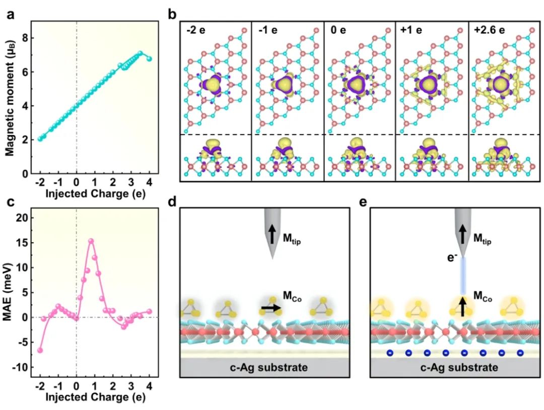 该电子态的有效调控为实现量子点自旋态的操控提供了可能。团队进一步通过磁性扫描探针进行自旋极化载流子的注入和积累,并发现了不同于非磁性探针作用下的电子态形貌转变,即随着磁性镍探针的持续自旋注入(图4),处于占据态的量子点自旋态表现出亮态到暗态进而又返回暗态的连续调控效应;而处于未占据态的量子点自旋态表现出相反的变化过程。第一性原理计算揭示了该量子点自旋态的变化是由于载流子积累导致的磁各向异性能的演变(图5)。