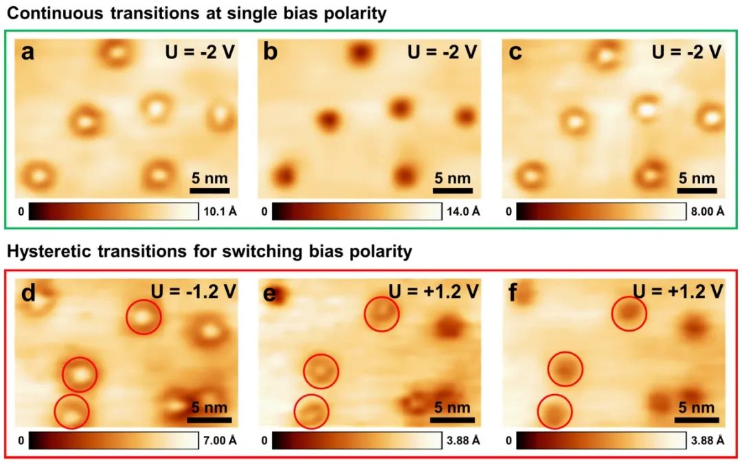 研究发现,使用非磁性探针在单极性偏置的多次扫描、偏置极性切换以及施加脉冲等多种方式下,可使Co量子点的电子态形貌在亮态和暗态之间进行规律且可重复的转换,且在切换偏压极性时,量子点的电子态发生了滞后的转变现象(图2)。第一性原理计算表明,量子点电子态的转变归结于载流子注入及其界面积累所导致的量子点量子能级的移动(图3)。