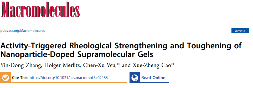 该工作以“Activity-Triggered Rheological Strengthening and Toughening of Nanoparticle-Doped Supramolecular Gels”为题发表在高分子旗舰期刊《Macromolecules》上。论文链接https://doi.org/10.1021/acs.macromol.3c02488。文章第一作者为厦门大学物理系博士研究生张印东,通讯作者为厦门大学物理系曹学正副教授和吴晨旭教授,该研究得到国家自然科学基金委、福建省自然科学基金委以及厦门大学校长基金青年创新重点等项目的支持。