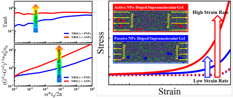 超分子材料因其独特的物理化学特性广泛应用于航空航天、固态电池、橡胶轮胎、仿生生物医药学等高新技术产业领域。合成超分子材料的生物医学和工业应用需要事先确定其机械强度和韧性。然而,实现具有高强超韧粘弹特征的超分子材料,是现今高分子动力学与流变学等研究领域所关心的核心难点问题之一。特别是,由交联和纠缠结构组成的超分子凝胶材料通常具有较高的机械强度,但韧性有限。为了在极端条件下如高压和快速强迫变形下仍能正常运行,这些超分子材料必须具有足够的强度和韧性来抵抗和消散外部冲击的破坏效应。具有各种化学和物理特性的纳米颗粒已被广泛应用于开发新型功能性超分子纳米复合材料。当它们的尺度与交联或纠缠超分子网络的网格尺寸相当或更大时,掺入纳米颗粒的动力学大多与基质链的结构松弛相关。在这种情况下,基质链的结构松弛仍然由链段的热运动驱动,而纳米颗粒由于它们的耦合运动无法对超出其尺度的基质链的松弛作出贡献。因此,通过纳米颗粒掺杂来实现超分子材料高机械强度与大韧性的结合是设计具有强大快速变形能力的功能性超分子材料极具挑战性的任务。