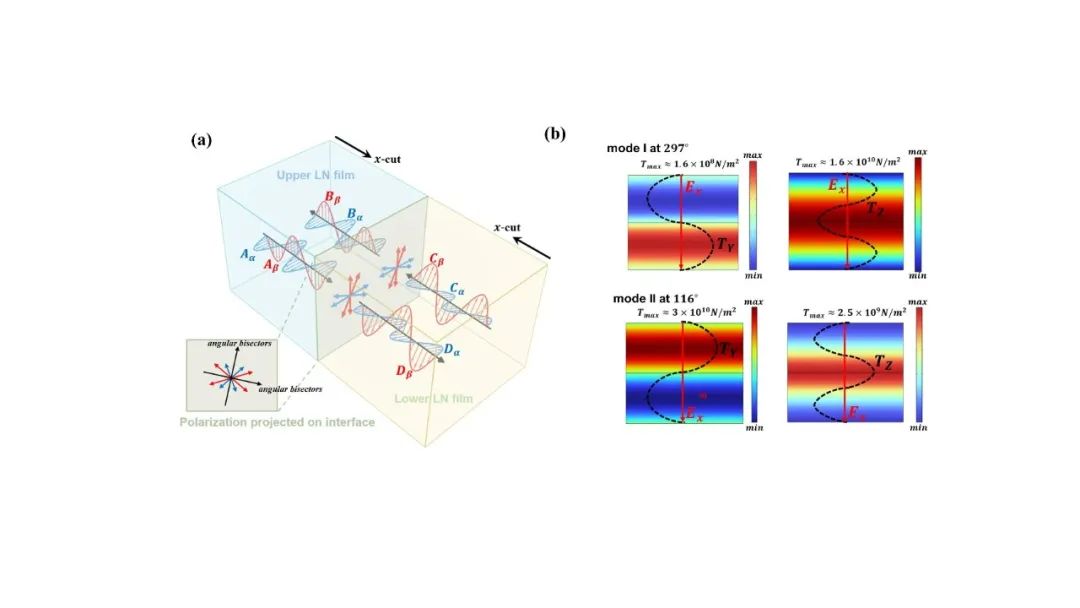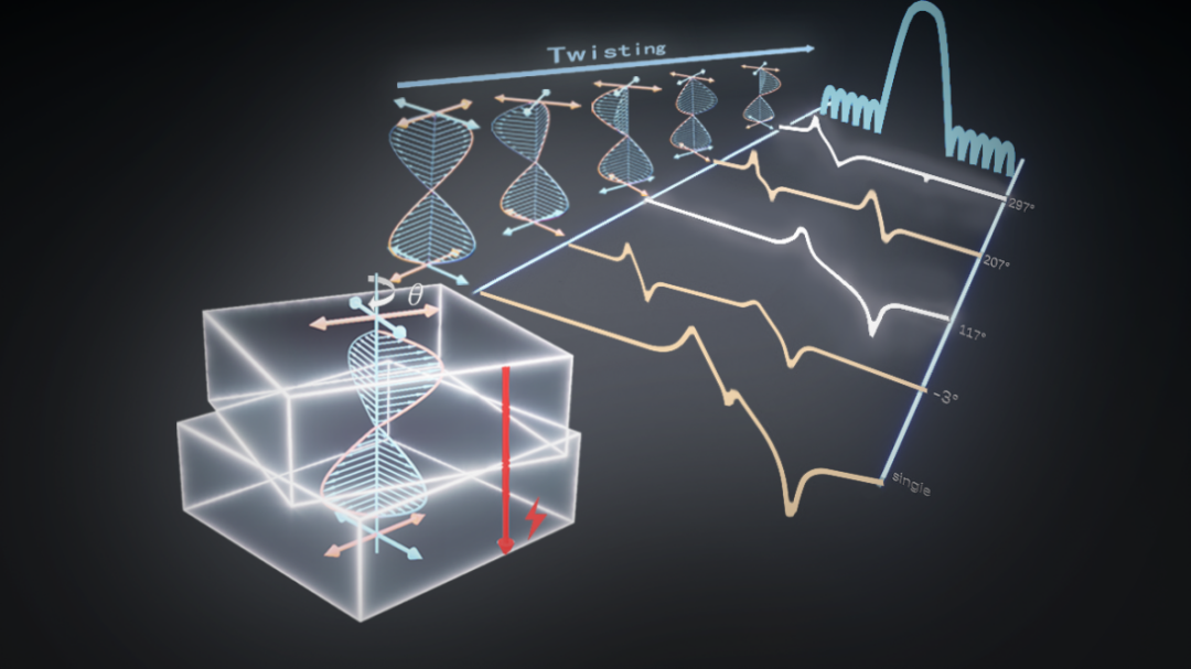 图1:在扭转双层压电材料中的“魔角效应”:声学驻波模式的偏振特性和声电耦合受扭转角度的调制。