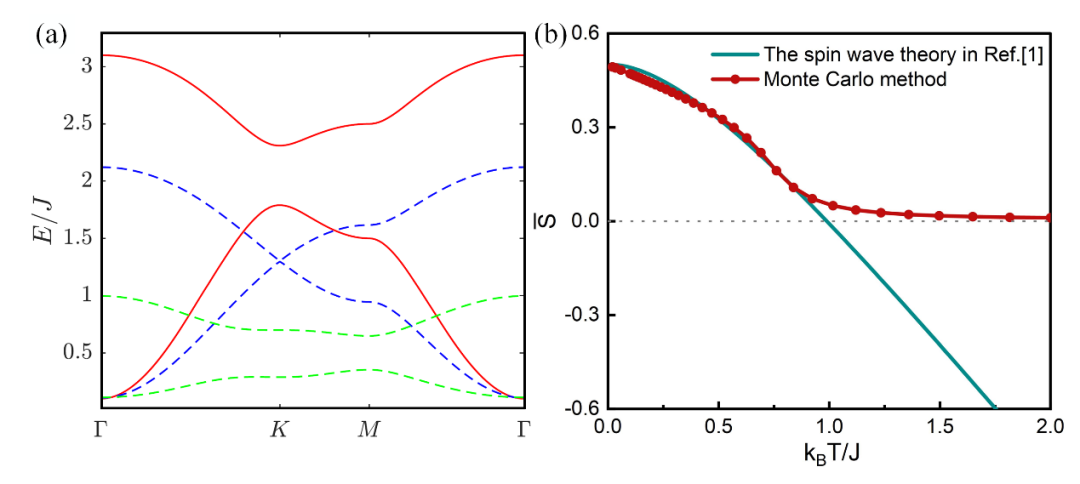 图1:(a)该工作中复现自旋波理论预测的磁振子拓扑相变。(b)原文自旋波理论(蓝线)和该工作中蒙特卡罗方法(红线)给出的磁化强度随温度的变化。