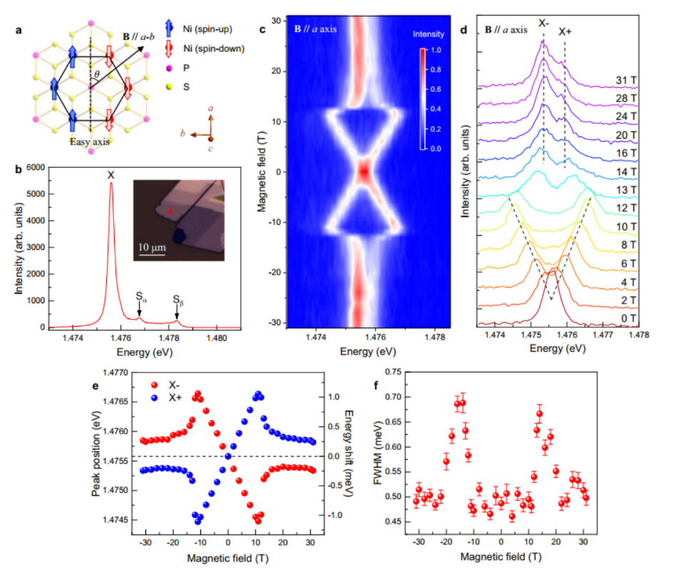 该工作通过系统性的实验研究和理论计算,探索了NiPS3在磁场作用下的激子效应,揭示了磁性激子在范德华反铁磁体NiPS3中的独特表现,为深入理解这类材料的磁性和光学性质提供了新的视角。实验中,研究团队利用磁光致发光(magneto-photoluminescence)光谱技术,观察了NiPS3在强磁场下的光学响应。他们发现,当磁场沿NiPS3晶体的a轴方向施加时,激子峰发生了明显的类Zeeman分裂,其Landé g因子约为2.0。这一结果为确认NiPS3激子为从单重态到三重态的跃迁过程提供了强有力的实验证据。